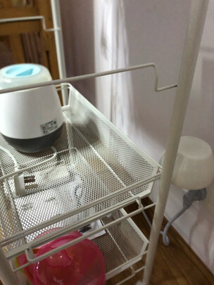 架子挺结实的,可以放奶瓶消毒锅。也不会晃,轮子也没啥声音,镂空搁架很平,放奶瓶也不会晃。也不怕漏水,四层可以放很多东西。