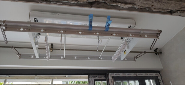 衣架刚安上,白色和屋顶的白色很配,很好看,使用起来很方便,平常晒衣服就不用拉伸杆就够了,晒被子可以使用拉伸杆,安装师傅安装速度快,当天给他打电话预约,第二天就来安装了,安装之后的垃圾都自行带走,注意卫生。很满意这次购物和安装