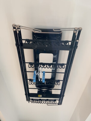外观很好看,白色和家里装修风格都很配,整台机器还是比较有分量,承重厂家标的是60斤,应该可以满足家用,不用担心,材质应该是铝吧,仔细看了下所以连接处,都还蛮紧实的,自己安装也还蛮简单的,厂家还返100元安装费,很贴心的行为,晾衣架自带大灯,灯光效果还蛮好的,晾衣架上升和下架的过程很平稳,噪音也不大,无线按钮很好用,直接双面胶粘贴,不用在墙上打孔,手机app也很好控制,不过一般无线按钮控制就好了,个人始终觉得母婴夹不太好用,夹东西很费劲,希望厂家得以改进