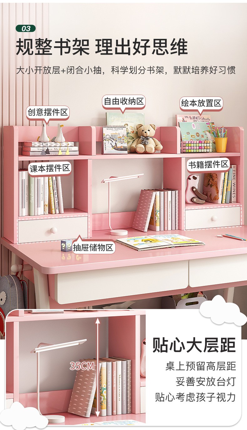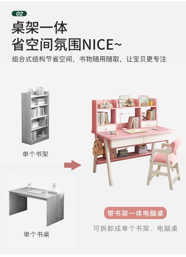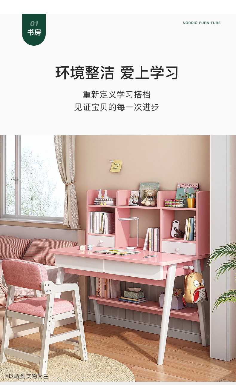 京东精灵空间 京东居家优选 儿童学习桌椅套装 学习桌 儿童书桌 可升降带书架 马卡龙粉 80cm桌椅套装 到手价:999元