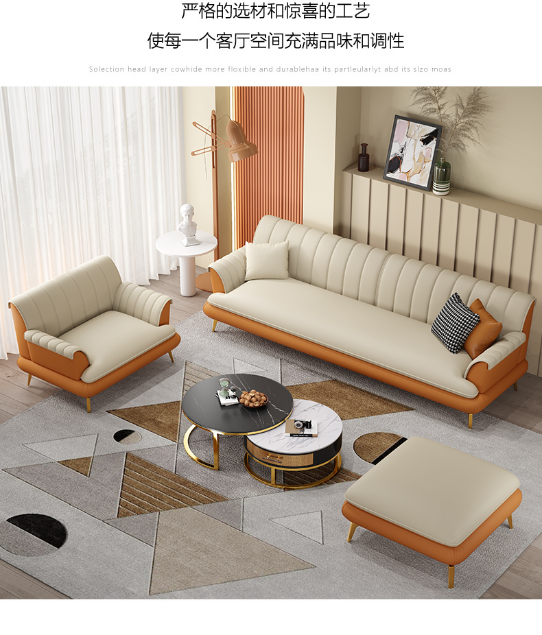 轩仕居乌金木实木沙发皮艺单人沙发椅组合新中式大户型别墅客厅牛皮休闲沙发椅现代简约轻奢家具 单人+双人+三人+茶几+角几*2+电视柜 白蜡木