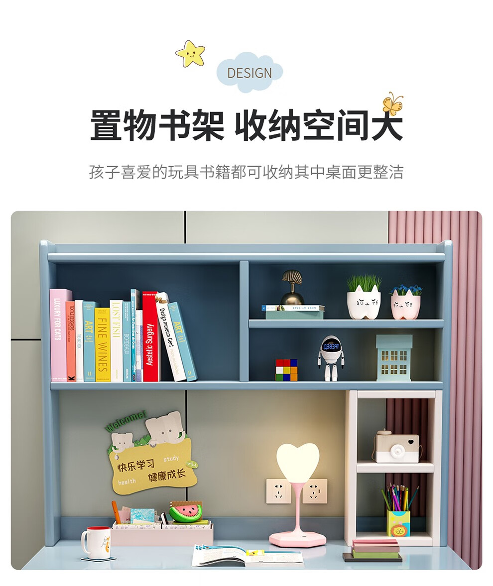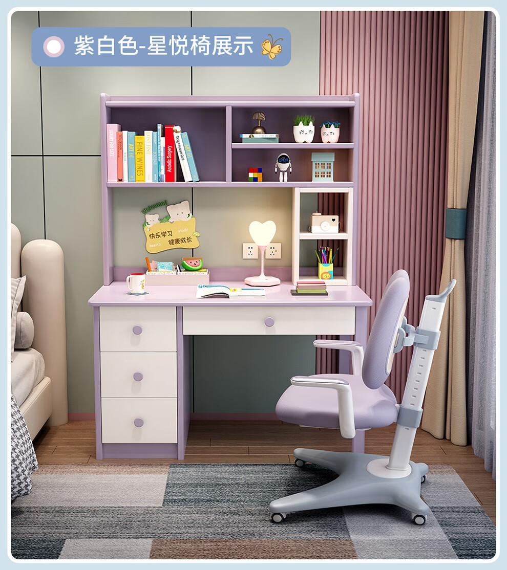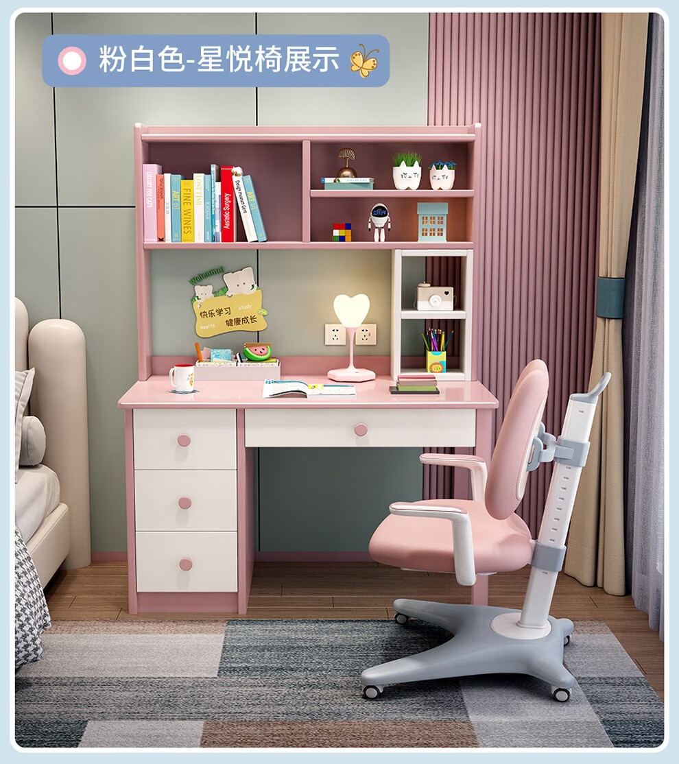精灵空间 京东居家优选 儿童学习桌椅套装 学习桌 儿童书桌 可升降带书架 马卡龙粉 80cm桌椅套装...