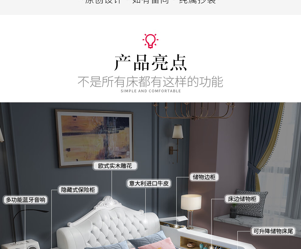 凯洛狮顿 床现代轻奢皮床2.2米大床双人床北欧奶油风软包床婚床真皮床简约大气 现代简约主卧大床 皮床单床 1500*2000框架结构无储物...