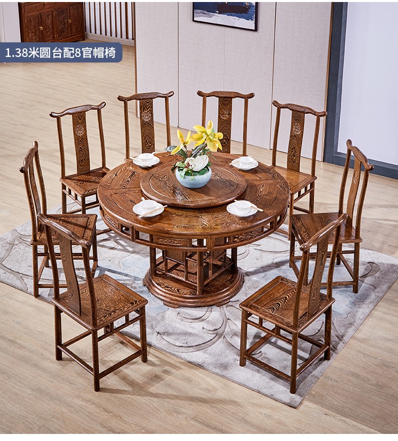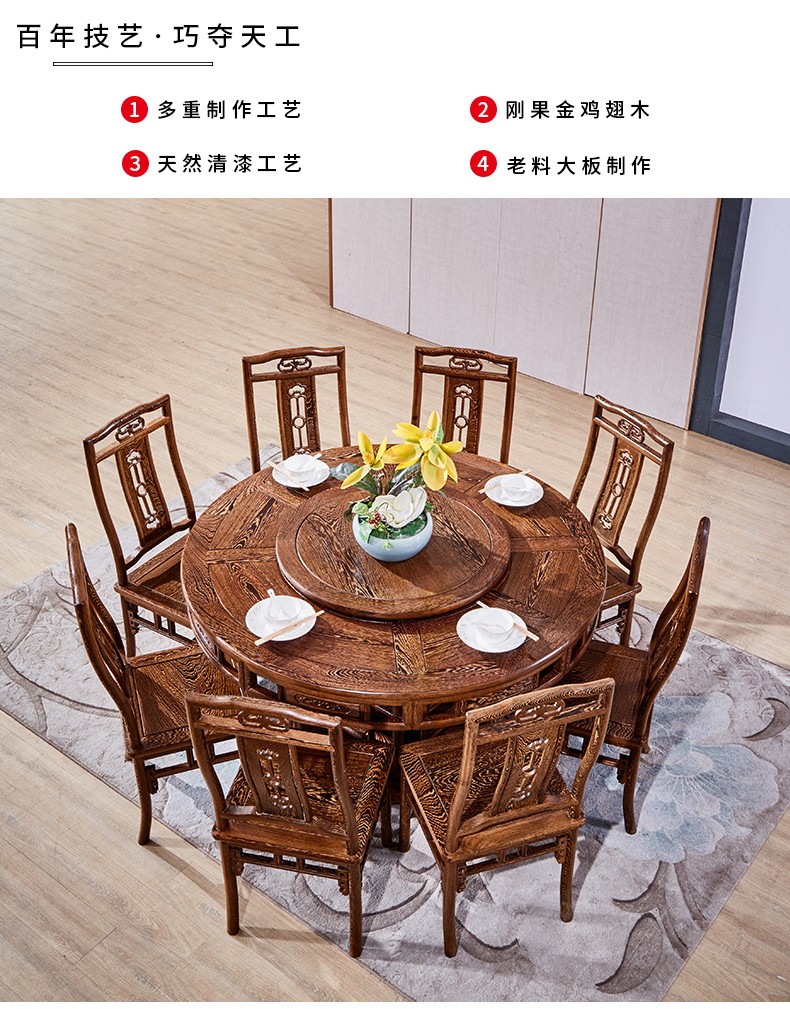 卡洛森餐桌 实木餐桌椅组合1.8米新中式酒店大圆桌带转盘家用圆形12人饭桌子 黑紫色(实木椅) 1.2米单桌(配0.8m转盘)...