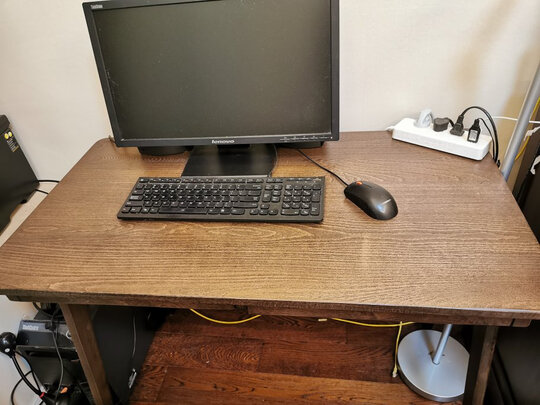 桌子大小刚好,适合一个人使用电脑,占空间不大。式样简洁大方,整体稳固,不摇晃。前面还有两个小抽屉可以放笔等小东西,挺实用的。桌子颜色深色,显得稳重,总体还是挺满意的。要说点不足,就是桌子后脚的横档正好挡住机箱,如果把电脑机箱放在里面,就会感觉机箱有点靠外突出,容易碰到,最好把机箱放在桌子一侧的外边。另外收到货后发现桌面一角稍微有点磨损,但不影响使用也就不计较了。