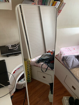 外层的金属边框很窄、显得镜子部分很大,表面光滑不刮手。镜子自带的架子打开各种角度都很稳,不会乱晃。占地少,可以挂壁或者直接放墙边,很适合在家穿衣照照。镜子面完美,不过反面有一些胶水痕迹。