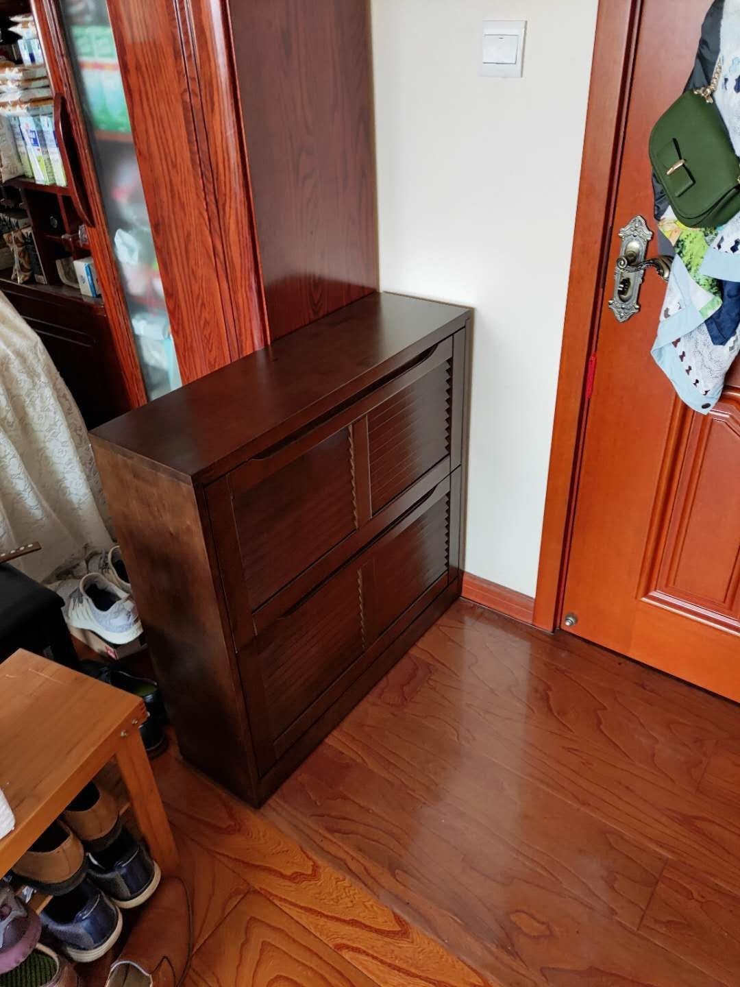 实木鞋橱,质量非常好,正好适合这个空间,而且看图二就知道它帮解决了多大问题了哈哈哈哈哈哈!辛苦快递小哥了,我还是专门请假回家帮他抬上来的……