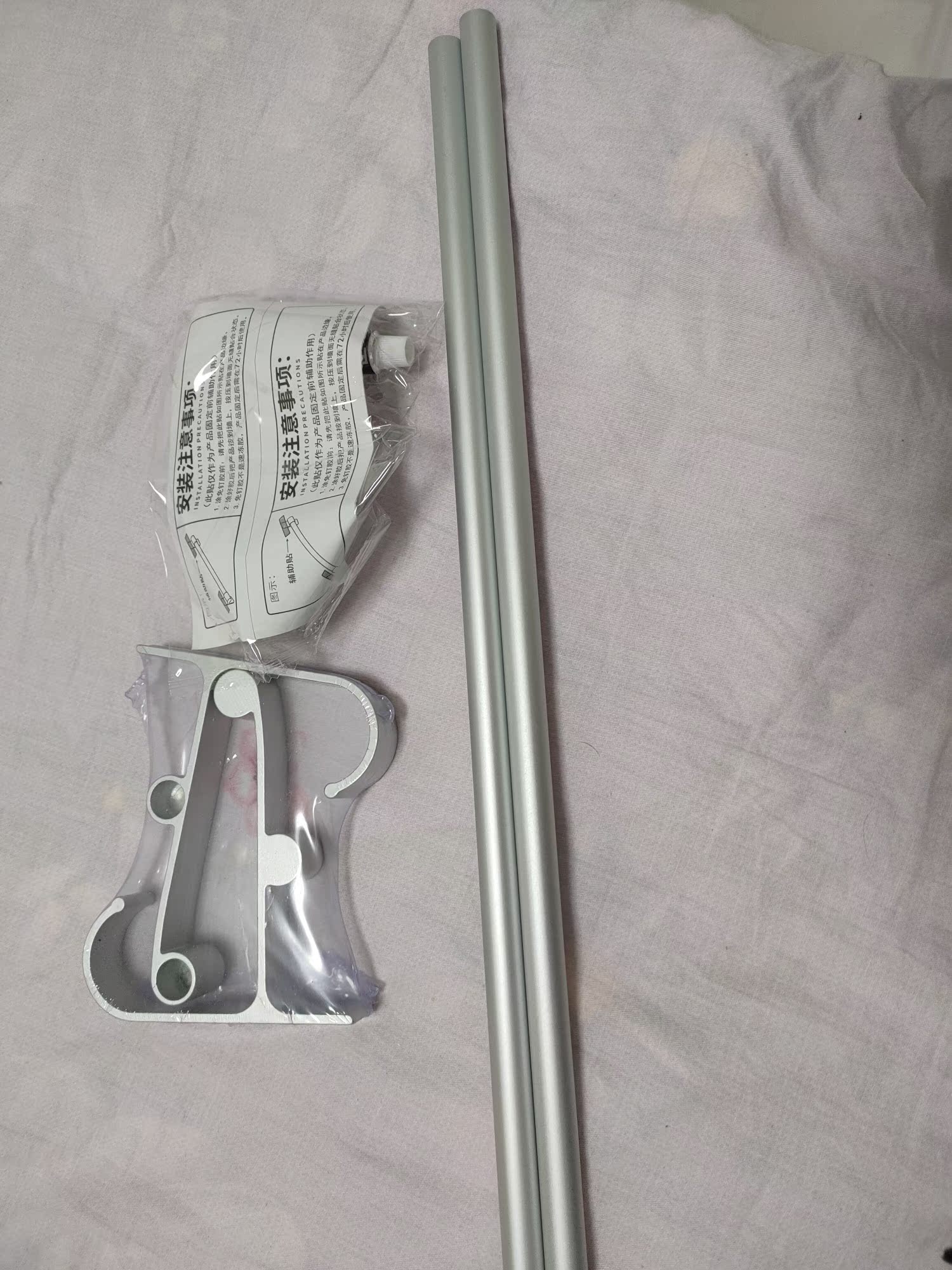 管材厚实,无毛刺,按照简单,送的兔钉胶和辅助贴,不用打孔,方便很好