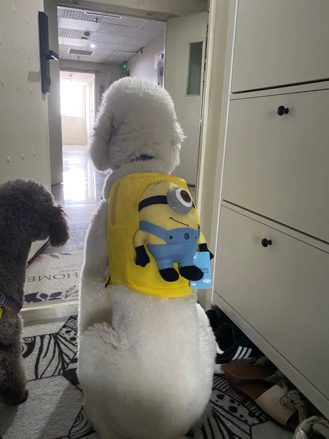 第一次看它背书包,而且不抗拒,若无其事的样子.哈哈哈哈?