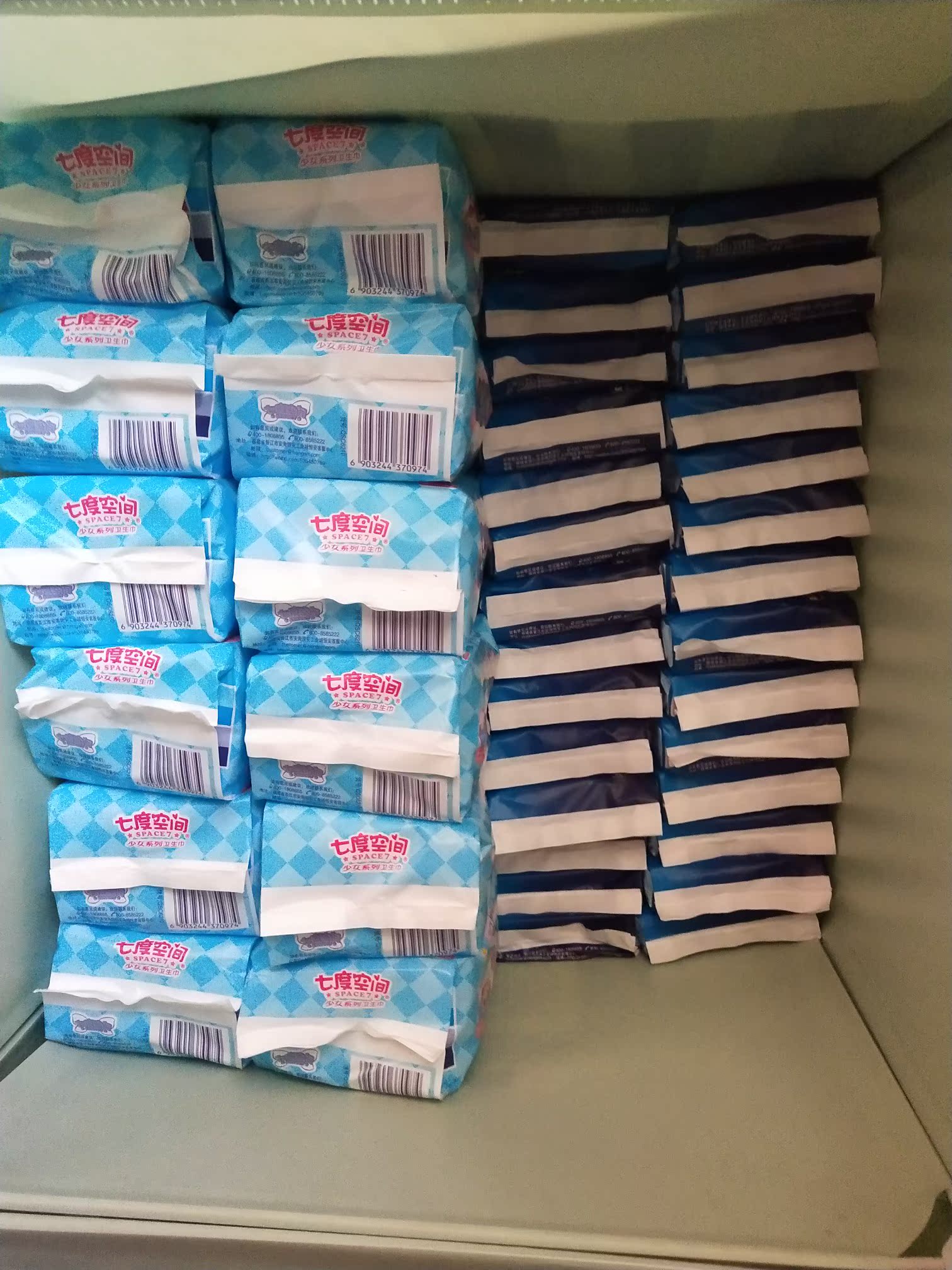 自从接触了七度空间,就一直用,没再换过。整箱入手,可以用挺久,不用担心要用的时候才发现没有了。。 275cm的长度,刚刚好。每包10片,这次入手了24包,搭配长款的使用。感觉可以用一年。。哈哈。纯棉的。很舒服。。点赞笔芯。唯一就是到货箱子好破。希望可以改进。哈哈。