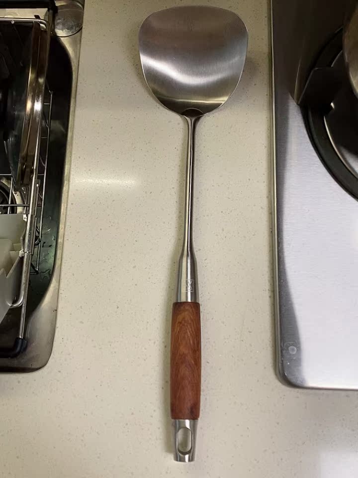 收到就用了,304不锈钢的材质加上花梨木的手柄,不锈钢不容易生锈,而且也不重,大小合适,炒菜拿着还不烫手,一套用着挺齐全和方便的,好评