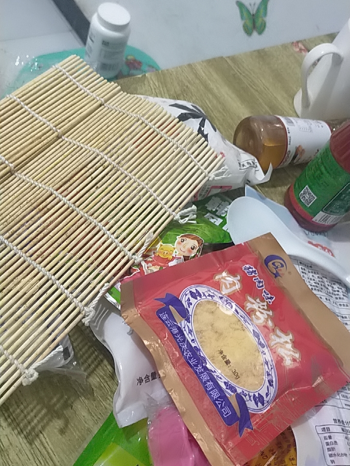 海苔很香,特别多,刀很好用,帘也行,醋和萝卜还好,可能我不习惯那个味道,我蘸的芥末