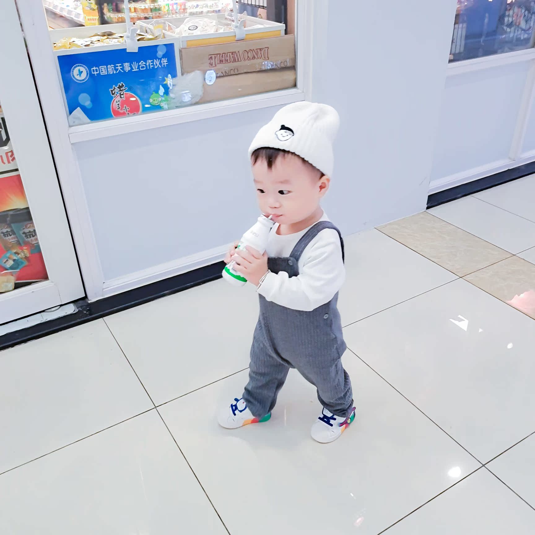 快递收到了,衣服穿上很舒服,我家身高80cm,体重21斤。买的80码,裤腿有一点点长,刚好秋天也可以穿,小孩子长得快。面料是纯棉的。白色t搭配灰色背带裤很时尚。