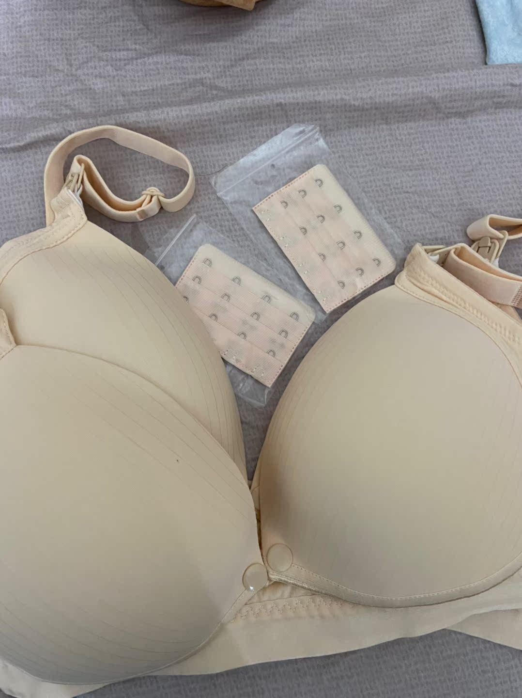 哺乳期以前的内衣完全不适合了,喜欢这种前面开口的,肩带也有搭扣,卖家贴心地送了同色系的延长带,胖点瘦点都能用啦!