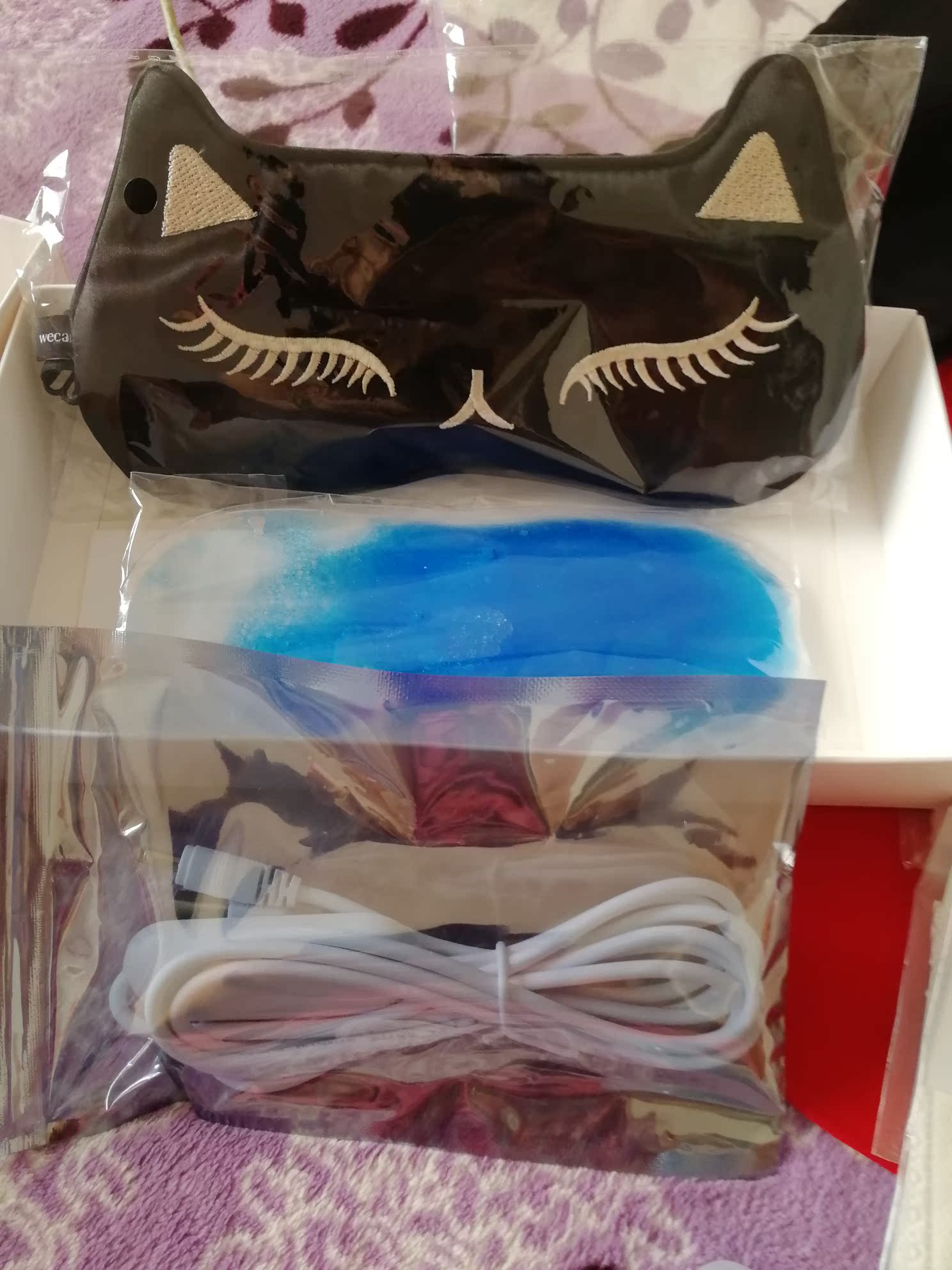 眼罩收到了,质量很好,收到以后第一时间跟家人每人试用了一次,卖家还送了很多礼品,两个药包,耳塞,还有冰敷袋,有好几个档位,可以随时调节温度,尤其是充气枕,可以一边贴眼罩可以一边躺着睡觉听歌,超级舒服,特别适合熬夜党,快递也超级快,满意