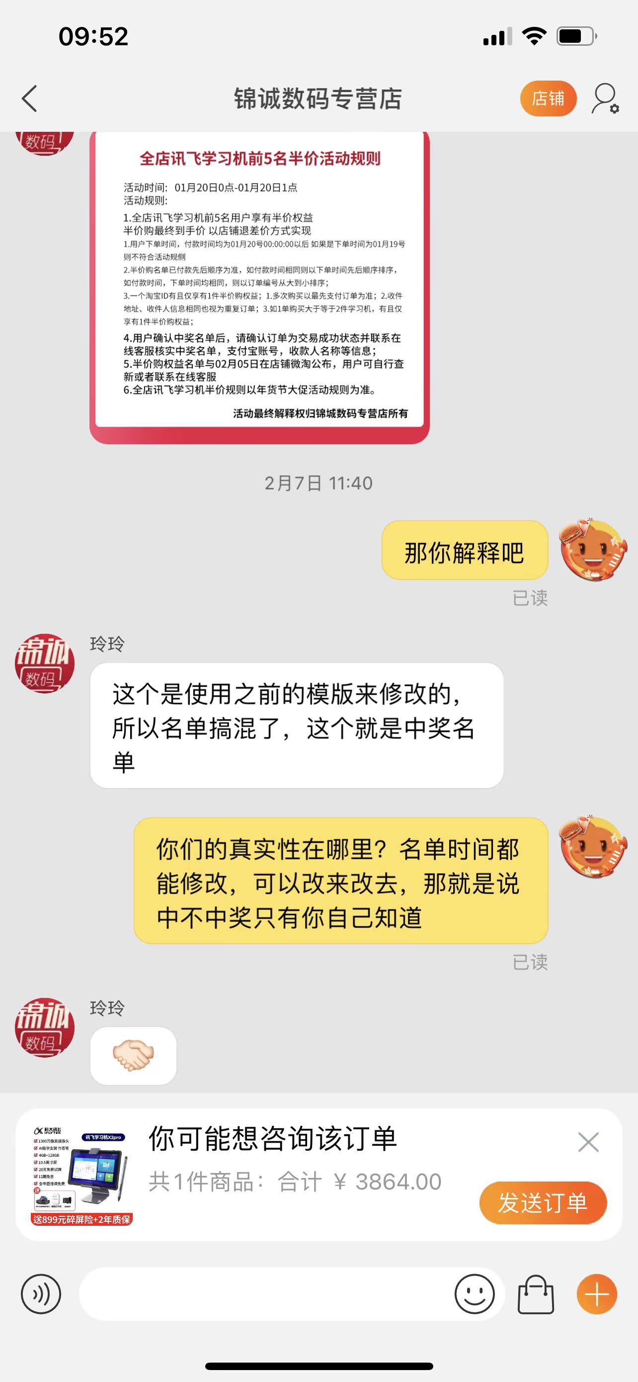 在这家店买大家一定要慎重考虑,我亲身经历2021年1月20日0点参加淘宝年货节半价活动,2月5日公布中奖名单,大家仔细看图,第五名是12月份的购买者,卖家说模版用错了,请大家买时擦亮眼睛吧,别耽误了在其他家能享受的优惠,我用我的前车之鉴来给大家提个醒!中奖名单商家能随意改动,真实性在哪里?商家自己知道!