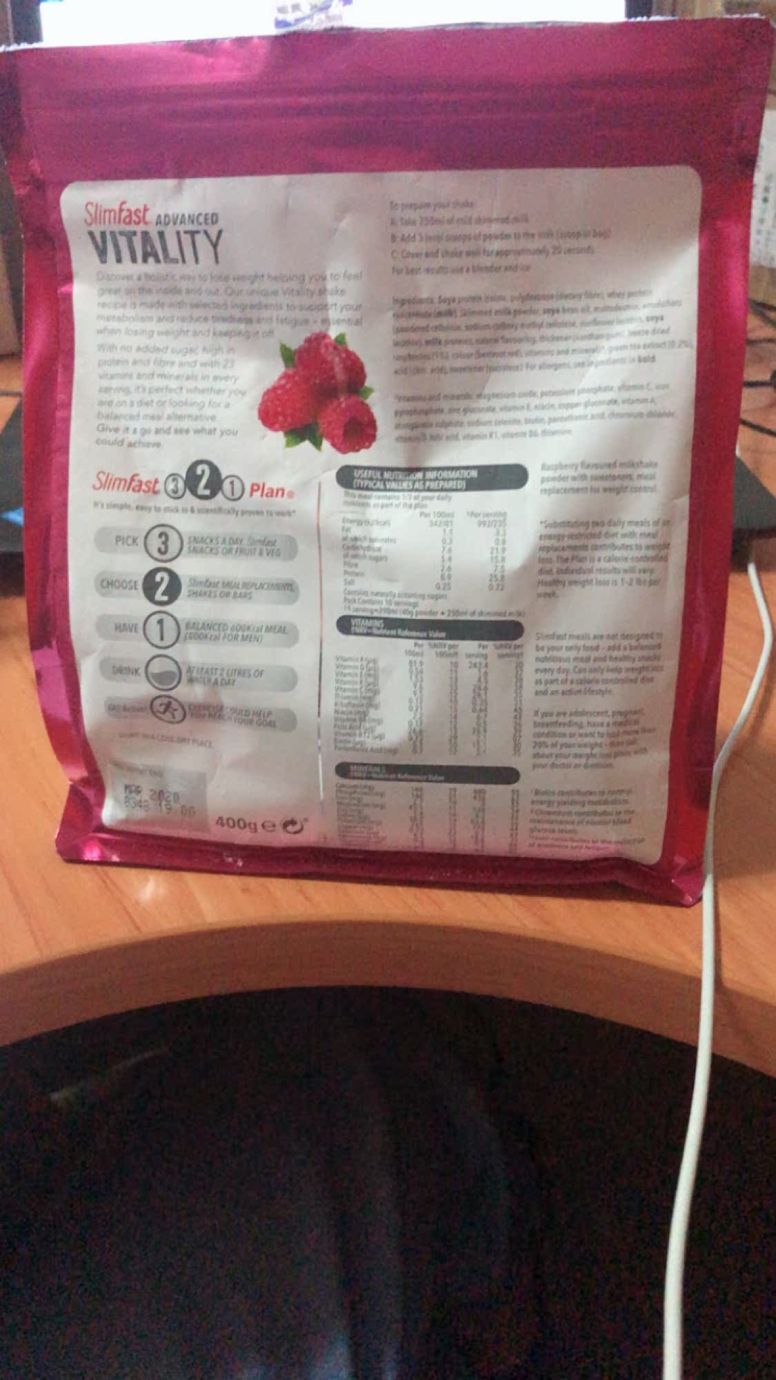 - 配料表:26克蛋白质,23维生素+矿物质,含有绿茶提取物。只需添加脱脂牛奶。无谷蛋白。高纤维。不添加糖。