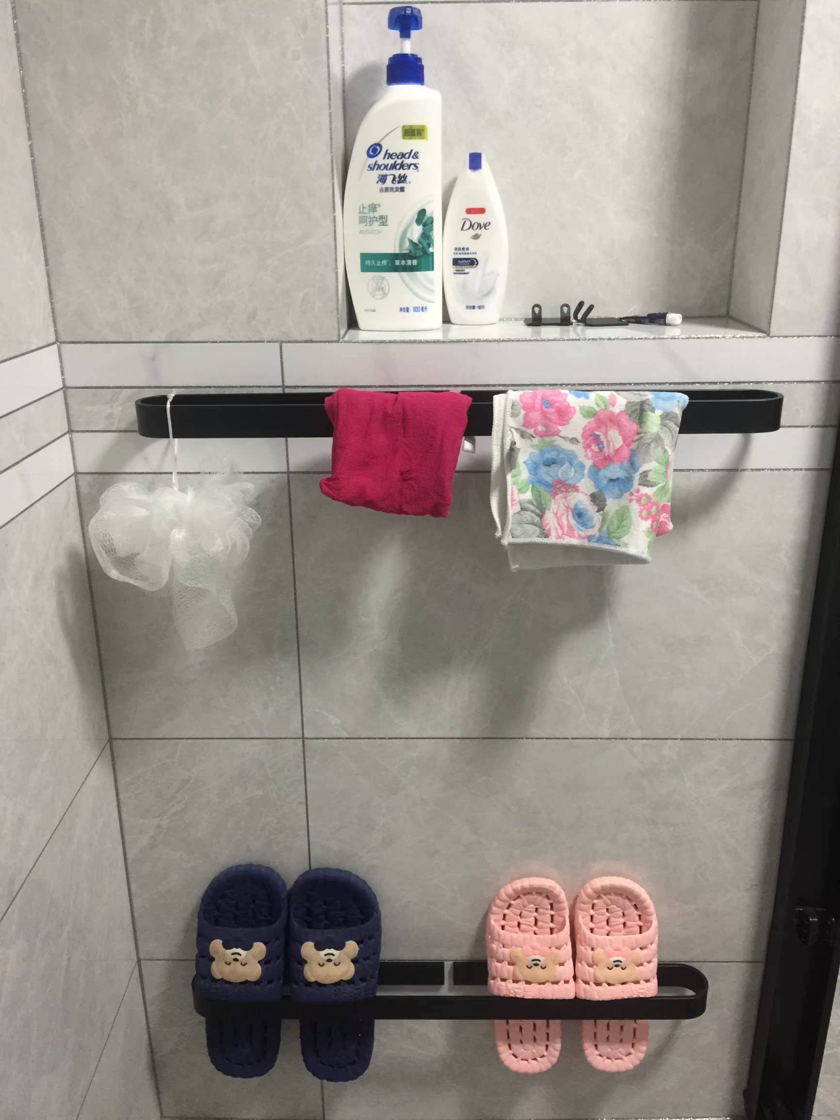 买了一个短的,一个带毛巾架的长款,短的放化妆品,长的放牙具毛巾,质量很好,有了它们洗漱台立正不少
