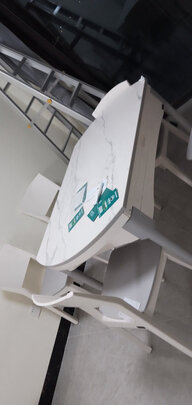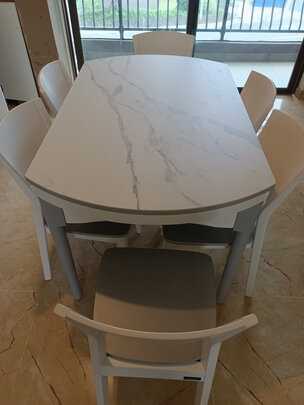 饭厅空间相对比较宽裕,所以买了1.3米+6个椅子的这款。款式中规中矩,饰纹一般,主要是看中岩板硬度比较高耐刮,也比较好打理。