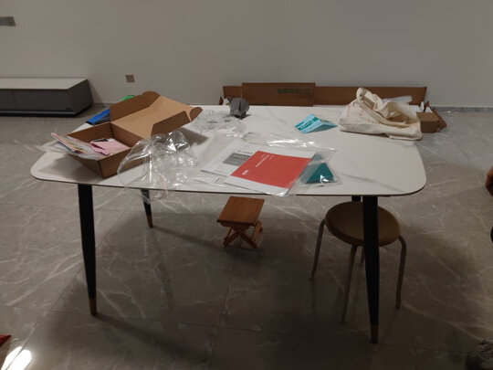 桌子上快递直接送货上门的,这个非常好;拼装很方便,四个角上螺丝倒过来就可以了;这个桌子瓶装起来后感觉比想象中的结实,本来担心这个岩板坚固问题,但是安装后发现不用担心,因为它本来有一个底板,底板再承托住这个岩板的,还是挺坚固的,板面是磨砂的。后面就看这个板面耐不耐磨了。